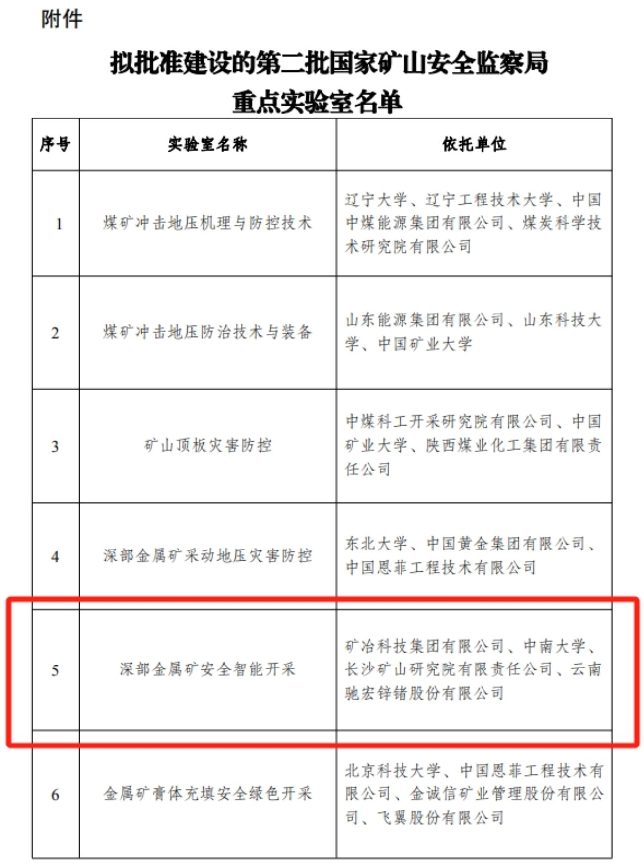 近日,国家矿山安全监察局发布《国家矿山安全监察局关于批准建设第二批重点实验室的通知》(矿安函〔2024〕33号),全国共有13家实验室获批。由矿冶集团牵头,联合中南大学、长沙矿山研究院有限责任公司、云南驰宏锌锗股份有限公司申报的“深部金属矿安全智能开采国家矿山安全监察局重点实验室”成功获批。这是HTH.COM牵头建设的第一个国家矿山安全监察局重点实验室(国家部委级),体现了HTH.COM在金属矿产资源深部开采领域的创新实力和领先地位,是矿冶科研平台建设的又一重要成果。